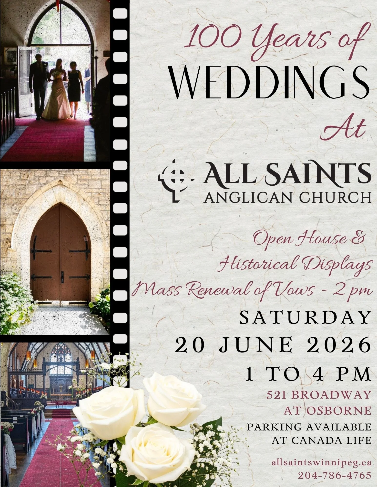 In honour of the centennial of our church building, and 100 years of weddings, we invite you to a celebration of Holy Matrimony. The event will include an open house with displays of the history of weddings, as well as a mass renewal of vows.