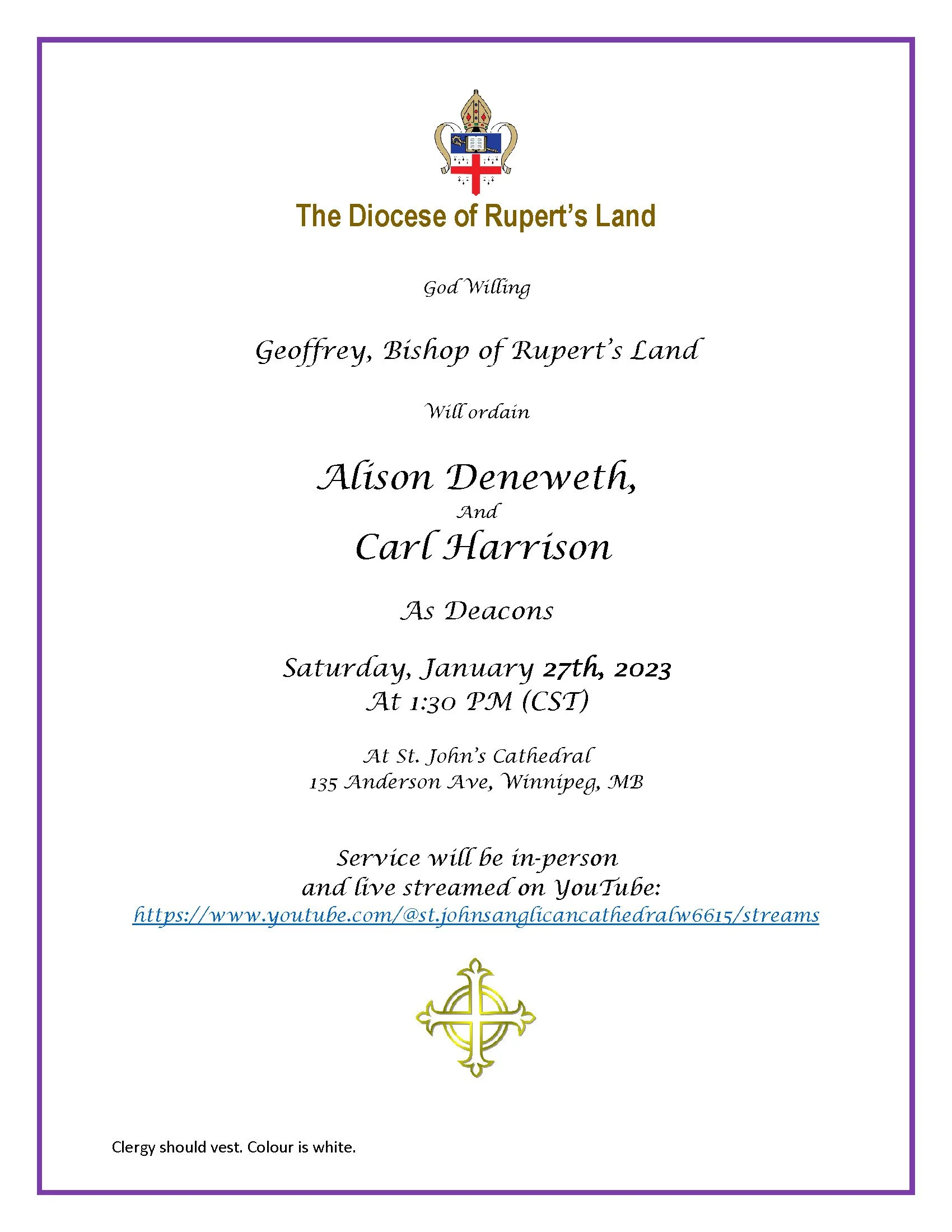 Come out and celebrate with Carl and his fellow ordinand Alison Deneweth. A reception will follow.